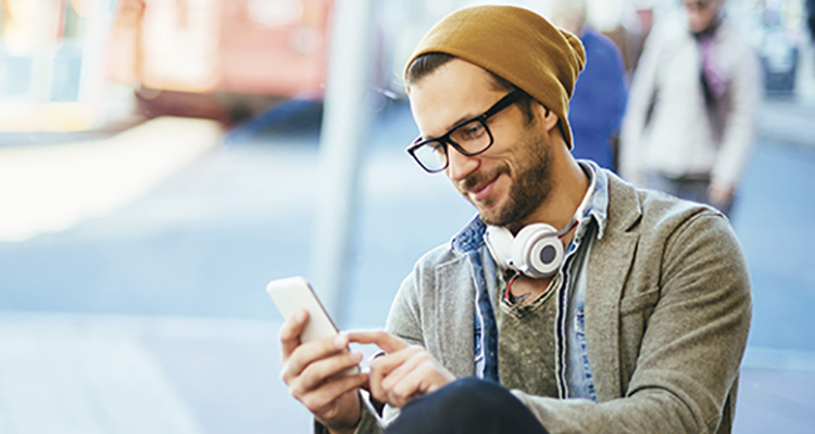 Junger Mann trinkt Kaffee und schaut auf sein Smartphone.